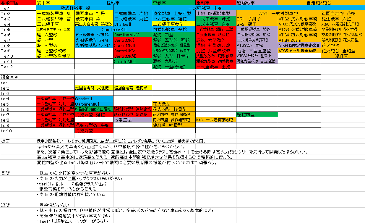 WoT風開発ツリー。これと同じようなツリー表があと3ヶ国分あるが、OOPSの管轄ではないという設定のため割愛する。解説が面倒
